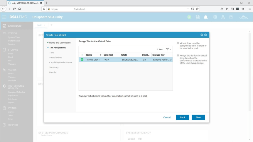 The next step will launch the Create Pool Wizard to create the initial storage pool. On this step go back to your VMware Workstation Pro software, choose the Virtual Machine Settings of the UnityVSA VM and Add a New Hard Disk (.vmdk) with the desired capacity (ex. 100GB), the virtual appliance will recognize the new hard disk automatically when finished return to the Create Pool Wizard on your browser to continue with the pool creation. After assigning a name to the pool, the next step Tier Assignment you will need to select the View/Edit button to assign a Storage Tier to the Virtual Drive and then move forward to complete the next steps.