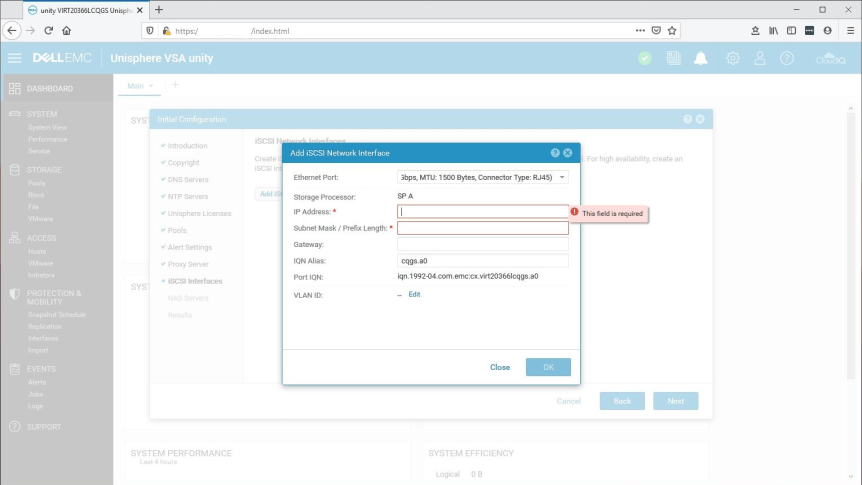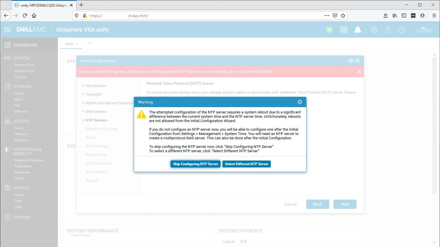 The following guided steps are pretty straightforward, here you will need to add your DNS servers, NTP servers, Unisphere Licenses, Pool, and iSCSI Interfaces among others. If you can’t assign the NTP server for any particular reason during this step you will be presented with the following warning screen, skip the configuration and later on add the NTP server under System Setting > Management section.