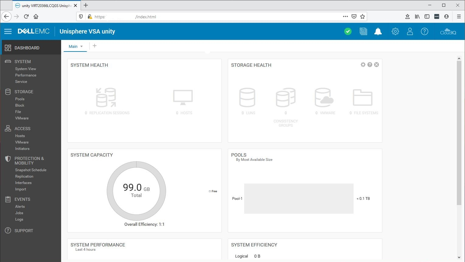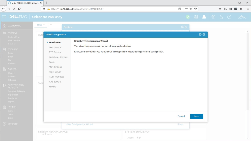Finally, you can redirect your browser to the IP Address assigned to the UnityVSA and start managing the virtual storage appliance in the same way the physical unit is managed.