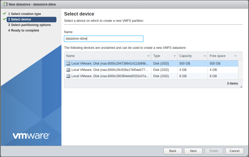 Next let’s add the additional required datastore capacity using the previously created 500GB hard disk, on the Navigator select Storage and New datastore…