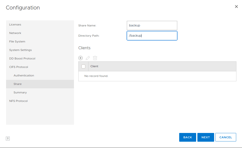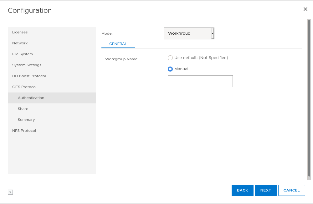 Almost finished, now to use the virtual appliance as a backup repository we need to define the access protocol from the two available options, CIFS and/or NFS. For this exercise, I will choose CIFS, but the NFS protocol is available if you want to configure it. First, select Mode as Workgroup, and under Workgroup Name choose Manual and the name you want to use, hit Next. Moving forward add the Share Name and Directory Path, hit Next, and Submit to finish the configuration of the CIFS access protocol.