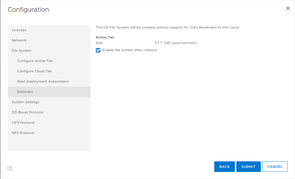The next step will let us configure and assign storage capacity to the Active Tier, at this point is not necessary to add capacity to the Cloud Tier, this is something that could be done later if required. After hitting next you can confirm the amount of capacity assign to the Active Tier, hit Submit, and wait a little bit until the File System is created and enabled.