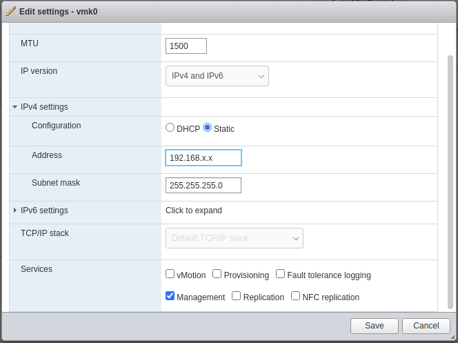 First using the Navigator select Networking, then the vmk0 adapter, edit the settings and change the IP address from DHCP to Static and provide your IP address.