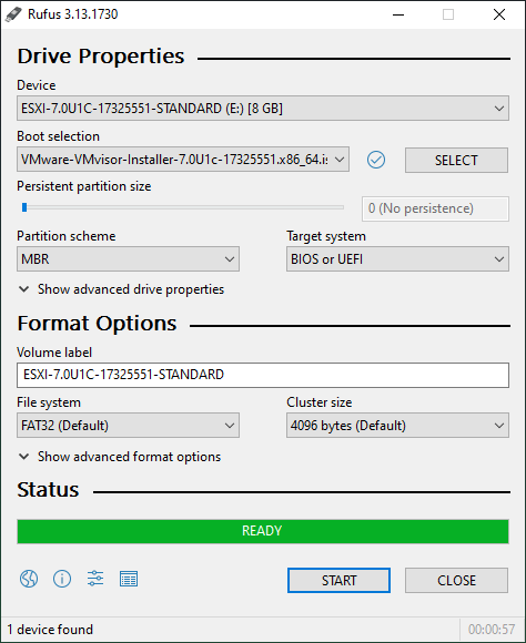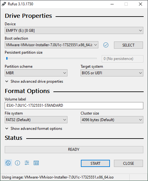 First insert your USB media, preferably an 8GB empty drive but you can use a smaller media. Next search under your Downloads folder for the rufus-3.13.exe (downloaded version at the moment of this post) and double-click on it. Choose SELECT and search for the ISO file previously downloaded from the VMware downloads site. You can leave the rest of the options as default but you can change the Volume label to your preferred media description.