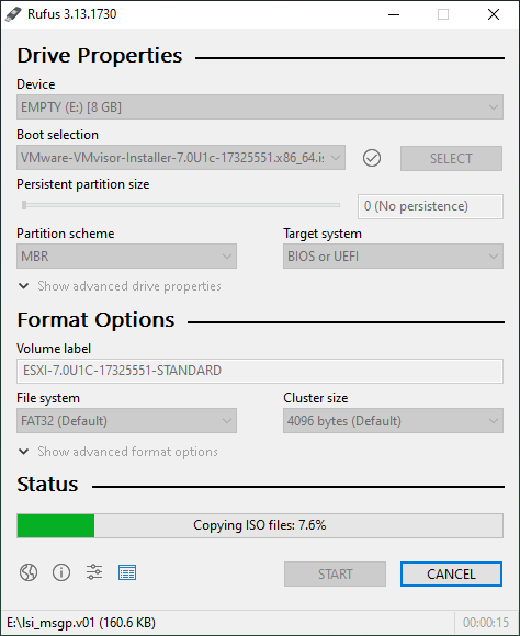 After selecting OK, Rufus will now start copying the ISO content to the USB media and will deliver a bootable USB media ready to install ESXi on a bare metal server or a virtual machine if required.
